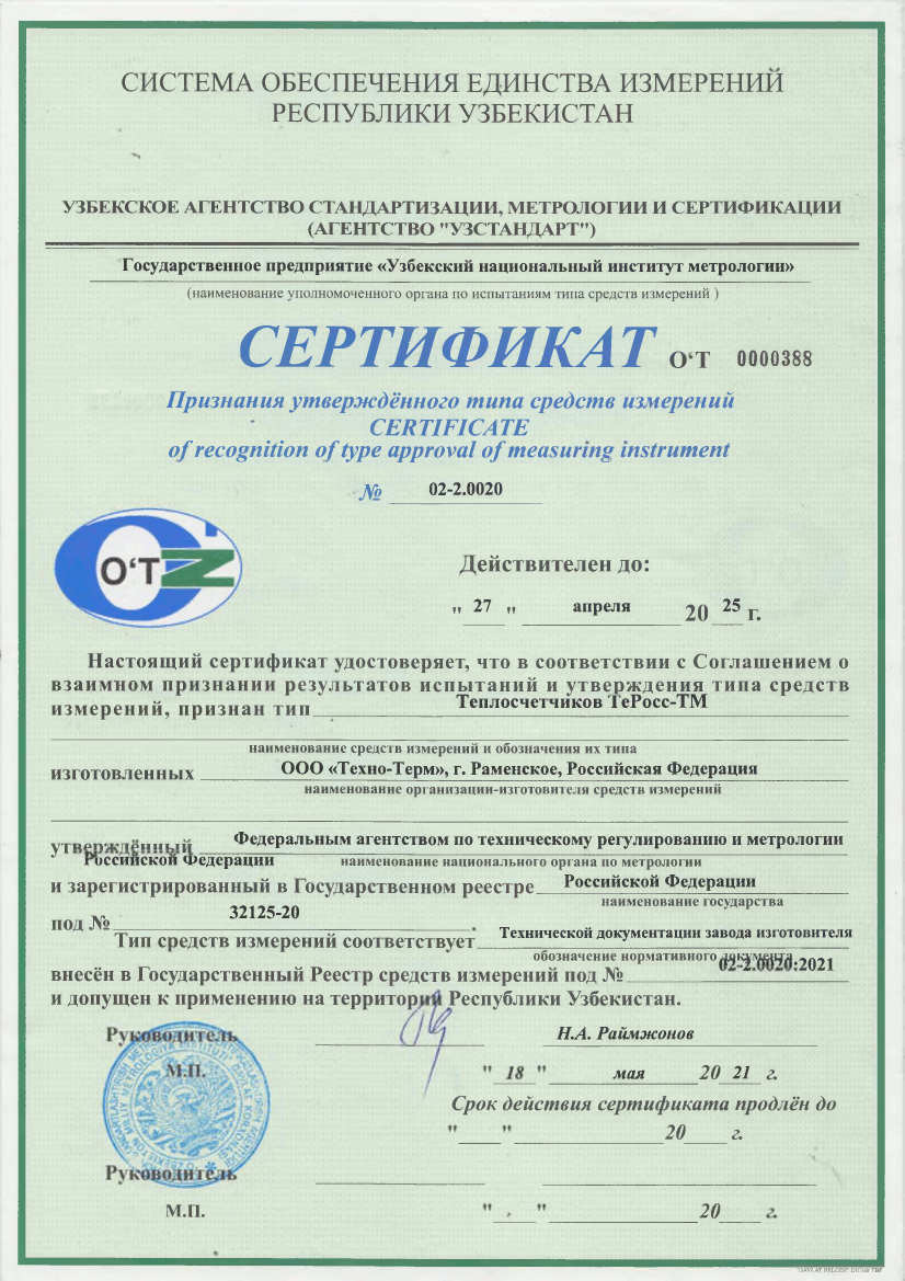Сертификат Признания утвержденного типа средств измерений Теплосчетчики ТеРосс-ТМ на территории Республики Узбекистан
