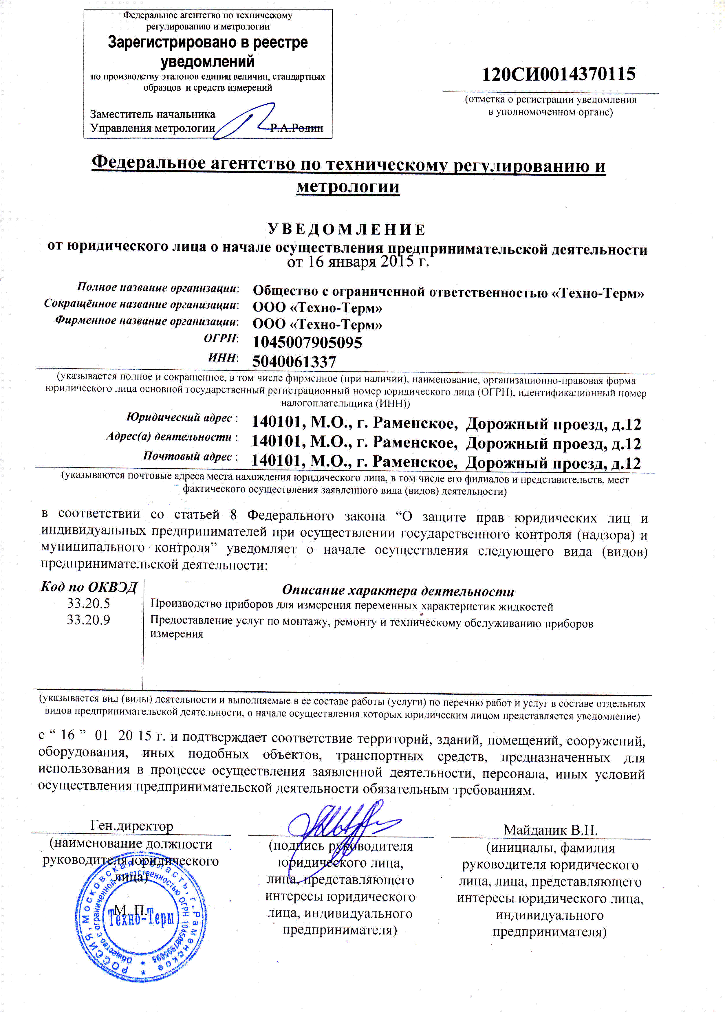 Уведомление на производство приборов